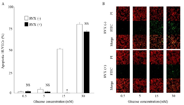 B: TUNEL assay of HUVECs pre-treated with or without RVX in high-glucose condition. Cells were treated with or without RVX as noted for hours, followed by glucose stimulation for 3 hours and labeled with fluorescein-12-dUTP and PI counterstaining.