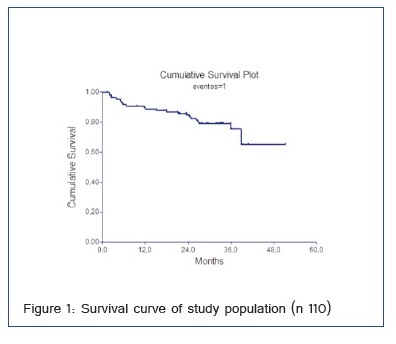 Survival was 88% in the first year, 76% in the second and 62% in the third year of follow-up (Figure 1).