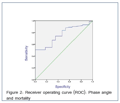 Survival analyses were performed using cumulative incidence estimates in the presence of renal transplantation as a competing risk. Simple and multiple Cox regression analyses were used to assess the influence of different variables on mortality [14]. For multivariate analysis, all variables showing statistically significant relation with mortality were included, as well as clinically significant variables, even if they didn?t achieve statistical significance. A P value < .05 was considered significant. ROC (receiver operating characteristic) curve to determine the sensitivity and specificity of phase angle for prediction of mortality was used. Precision estimates were computed using 95% confidence interval.